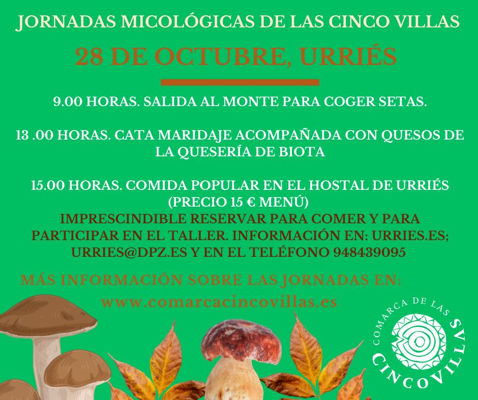 URRIÉS, 28 DE OCTUBRE 9.00 horas. Salida al monte para coger setas 13 .00 horas. Cata maridaje acompañada con quesos de la quesería de Biota 15.00 horas. Comida popular en el hostal de Urriés (Precio 15 € menú) Imprenscindible reservar para comer y para participar en el taller. Información en: urries.es; urries@dpz.es y en el teléfono 948439095