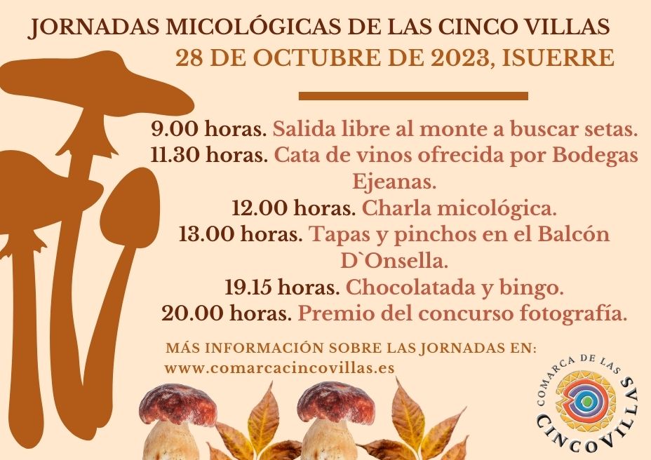 ISUERRE, 28 DE OCTUBRE 9.00 horas. Salida libre al monte a buscar setas. 11.30 horas. Cata de vinos ofrecida por Bodegas Ejeanas. 12.00 horas. Charla micológica. 13.00 horas. Tapas y pinchos en el Balcón D`Onsella. 19.15 horas. Chocolatada y bingo. 20.00 horas. Premio del concurso fotografía.