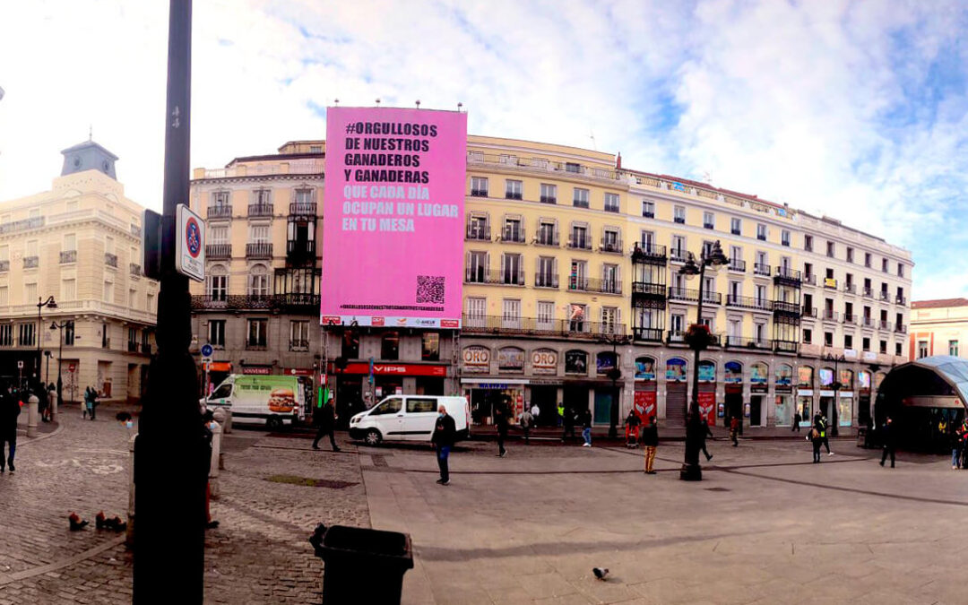 El sector del cerdo blanco ha desplegado una lona de grandes dimensiones en la madrileña Puerta del Sol con el lema «Orgullosos de nuestros ganaderos y ganaderas que cada día ocupan un lugar en tu mesa» y un código QR gigante que remite a una web con información sobre dicho sector ganadero.